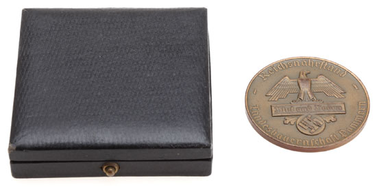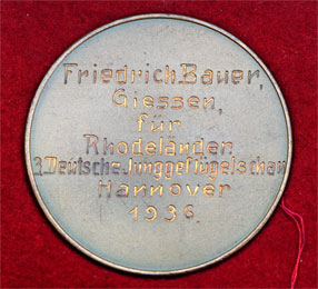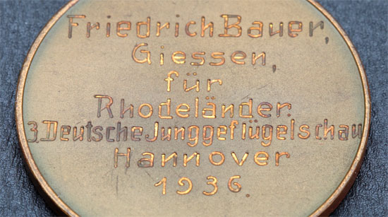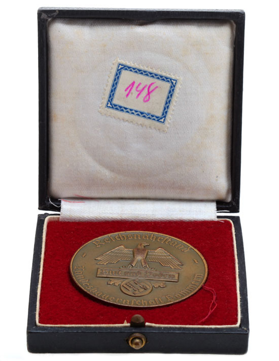 Cased Reichsnahrstand Pommern Award - Hannover 1936: RNS motto "Blut und Boden" (Blood and Land) Exhibition, Tombak, 50 mm, the reverse is engraved with the name of the winner, his city, the category, his prize, the exhibition city, and year.
