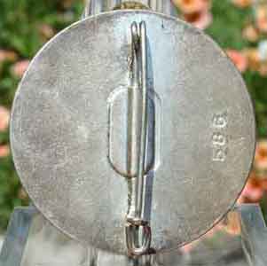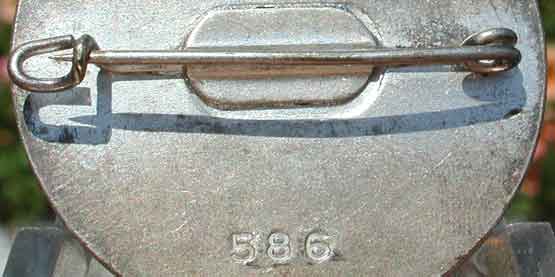 Very high relief rhodium-nickel plated copper badge, 40 mm diameter, serial number 586, light to moderate wear.