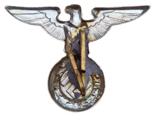 SA Model 1927 Hat Eagle: nickel plated tombac, painted swastika, 35 x 27 mm, faint RZM mark, light wear.