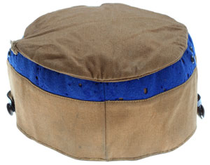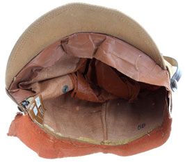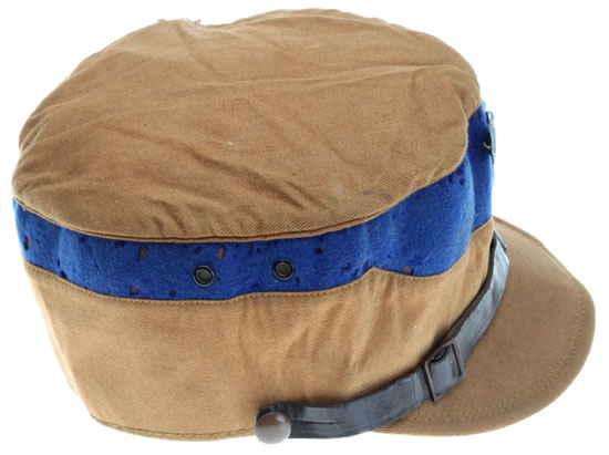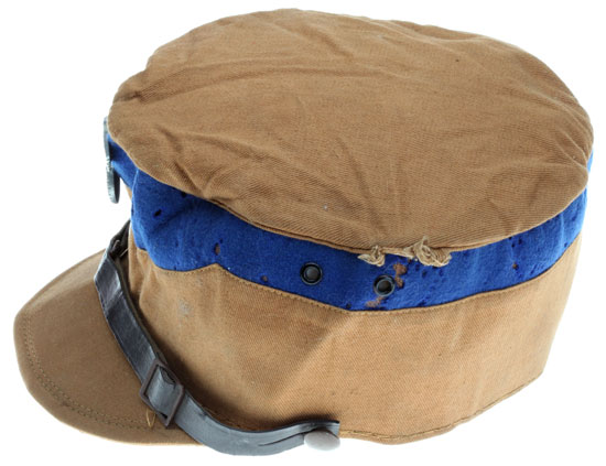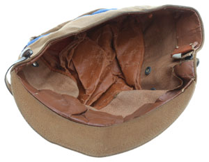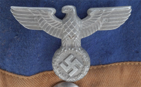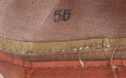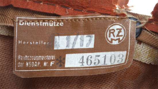 SA Enlisted Man "Coffee-Can" Hat: Dienstmutze, Wartime Model, 55 mm 1939 zink party eagle, steel button, brown cotton twill side panels have lost all stiffening, needs to be reblocked, steamed, and starched; cloth covered brim is still stiff with the normal center thumb crease that comes with regular wear, navy blue wool band signifying Hessen has many moth bites, nice supple brown leather chinstrap secured by correct brown metal snap-rivet buttons, top orange oilcloth lining marked size 55 has sepatated from left side panel - needs to be resewn, left side panel is also stamped size 55, brown leather sweatband has a tear on the right side, brown oilskin RZM label is stamped 1/17 serial # 465103; two brown metal ventilation vents on each side, 100% original, very repairable, heavy wear.