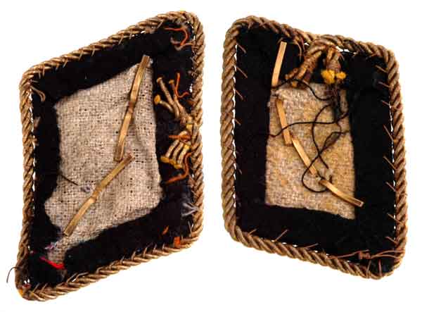 SA Standarten Fuhrer Tabs: Black wool over buckram stiffener, gold plated brass oakleaves, 3 mm twisted gold bullion piping, 45 x 60 mm, rare!, light wear.