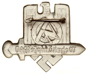 SA Wehrkampfe 1940: This is one of the few SA wartime badges you can find. It does not list a city because it was struck for SA men from any German city. WehrKampf badges were weapons training camps to qualify men destined for induction into the Wehrmacht. Non-magnetic metal, plated zinc finish, soldered magnetic steel pin, scarce, very light wear.