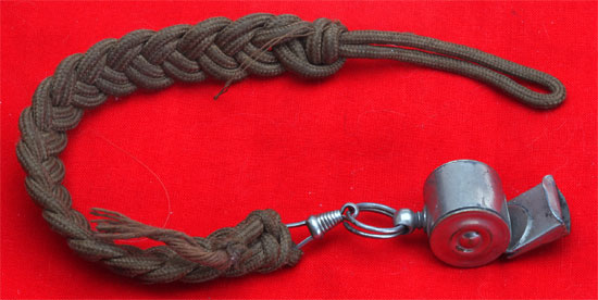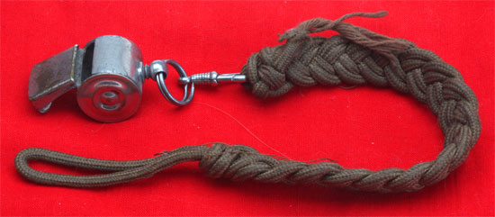 SA or HJ Whistle: nickle plated 4 cm brass whistle, 4 cm ring and swivel, 25 cm woven brown rayon lanyard, uniform removed, extremely loud, moderate wear.