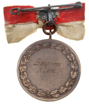 Unknown German State: tombac, 32 mm, red & white ribbon bow suspension, hand engraved "Gew(innen). vom Alex (Won by Alex)," light wear.