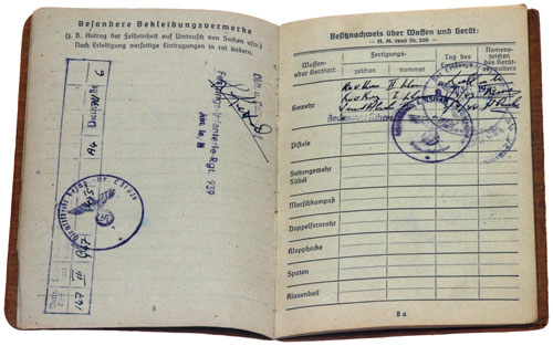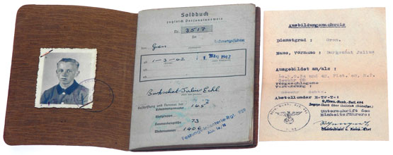 Soldbuch Julius Burgschat, 1942: Grenadier machinegunner in Fortress Infantry Regiment 939, copper plated staples, stamped Geheim (secret) on top, entries end in 1943, Ausbildungsnachweis document inside, light wear.