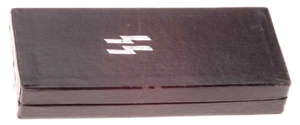 Box: tight fitting, 100 x 44 mm, stamped silver foil SS runes, glued paper hinge, grey flocked inserts, traces of faint rubber band residue across the top, very light storage wear.