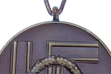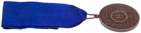 Die struck bronze medal, 38.0 mm, 23.20 gm (ribbon off), teardrop suspension, beveled ring loop, minutely textured fingerprint stipling in the field, excellent even color, the only visible flaw on the entire medal is a microscopic rim nick at 6 o'clock on the reverse side that is barely visible on the above photo, 26 cm ribbed rayon cornflower blue ribbon, virtually mint condition.