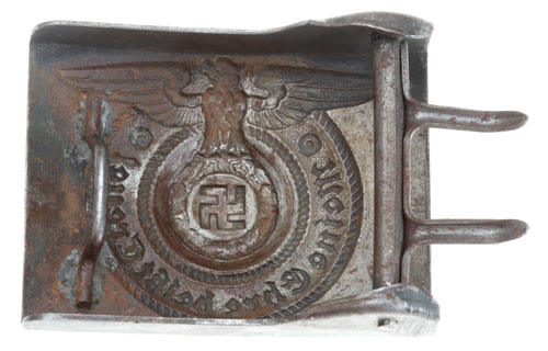 SS Enlisted Man's Steel Buckle: A very well made example, die struck, sharp detail, magnetic, 50 x 65 mm, 1 mm thick, 44 gm, unmarked, even the color and patina looks right, an almost perfect replica.