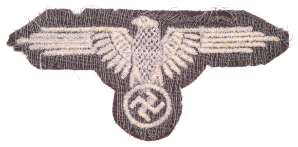 1944 Pattern SS EM Sleeve Eagle: Machine embroidered, grey thread on black wool with mesh backing, 85x35 mm eagle, small edge nip, unissued, virtually mint condition.