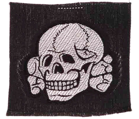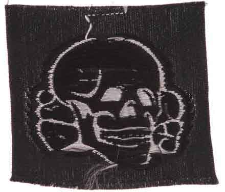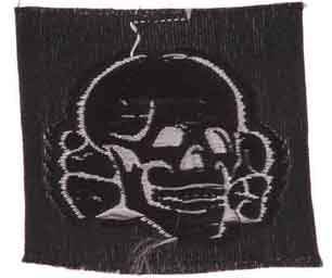 Black rayon base from a 45 mm wide roll, machine embroidered bevo skull in lusterous grey thread, scarce, mint unissued condition.