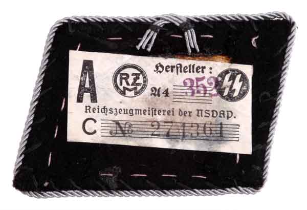 Black wool base over a tan buckram stiffener, twisted aluminum cord piping indicating a rank of Sturmbannfuhrer or higher, twisted bullion wire runes, RZM SS paper label, 40 x 55 mm, mint unissued condition, a beauty!
