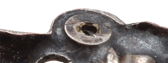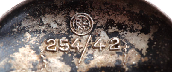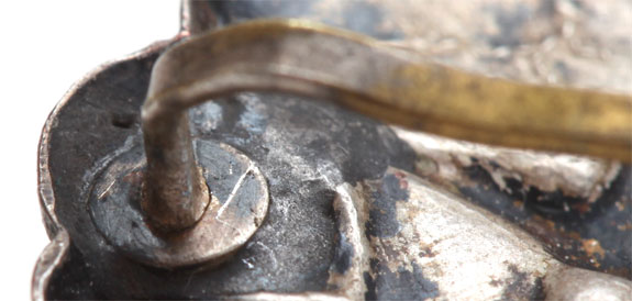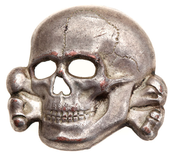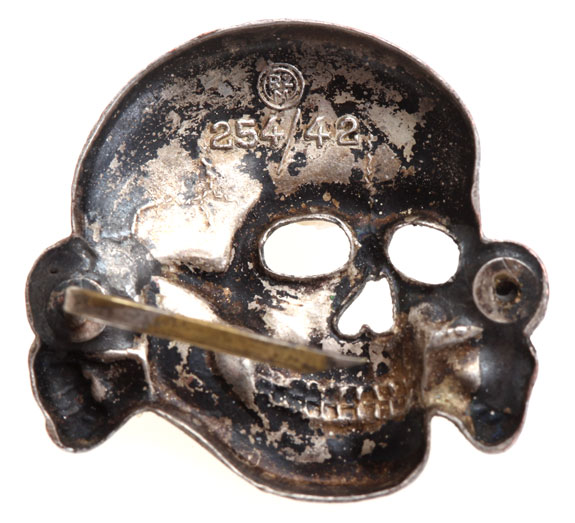 SS Visor Hat Skull: silver and nickel plated cupal, 30.8 x 28.3 mm, 2.25 gm, hallmarked "RZM 254/42" (Deschler 1942), missing right side brass prong, the SS officer removed all the silver on the obverse through polishing, the black silver oxide on the reverse was partially removed by the USA vet through curiosity so he could read the hallmark, overall moderate wear.