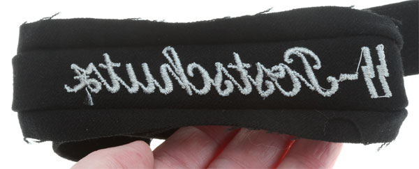SS-Postschutz Ärmelband: In March 1942 Hitler approved the incorporation of the Postschutz into the Allgemeine (General) SS and renamed it the SS Postschutz. On May 1 1942 Gottlob Berger became Leader of the Waffen SS Postal Protection with a strength of 4500 men. Machine embroidered grey threads on black wool, 52 cm, 32 mm high, stitched edges, very rare, blacklight tested, unissued mint condition.