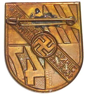 1933 SS Standarten 47 Parade Badge: Bronze plated tomback, Jena maker marked, red oxide stain on swaz, light to moderate wear.