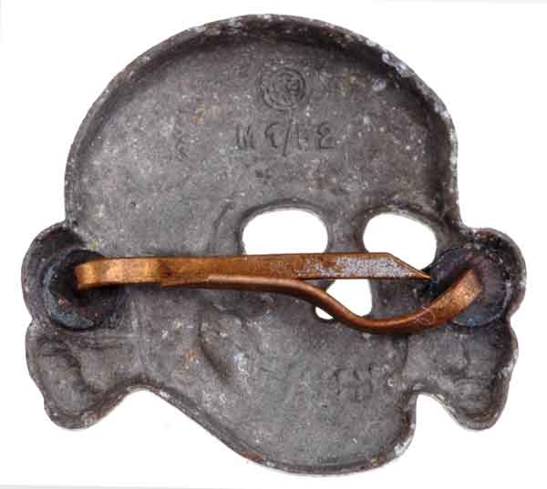 SS Visor Hat Skull: Die stamped zinc, obverse of skull has a nice silvered finish, thin silver washed tombac prongs soldered to round plates to increase strength, 30x30 mm, marked "RZM M1/52" (Deschler & Sohn, Munchen), light wear.