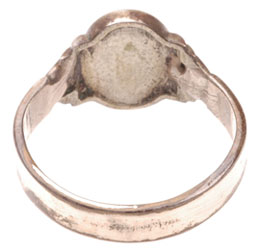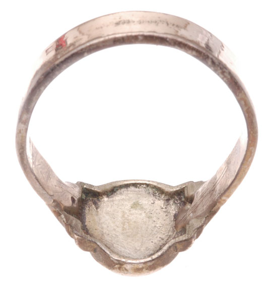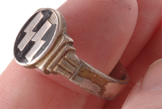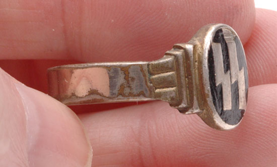 SS RING: Silver/nickle plated tombac ring, SS runes inset in a black bakelite oval with many small chips and one large chunk by the end of one rune, moderate to heavy wear.