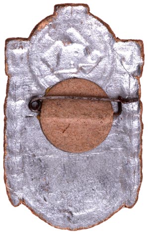WW1 Pilot ID for some unknown reunion or rally: pressed silvered cardboard with a glued on paper service ID label, 55x35 mm, steel pin secured by a pressure glued cardboard sticker, moderate wear, very rare.