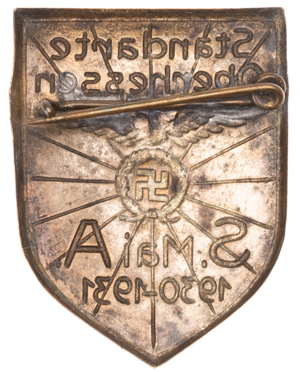 Standarte Oberhessen S. Mai A. 19301931: shield shaped, 30 x 38 mm, tombac, eagle over wreath and sunburst background, issued for the Standarte Oberhessen May assembly across 1930-1931