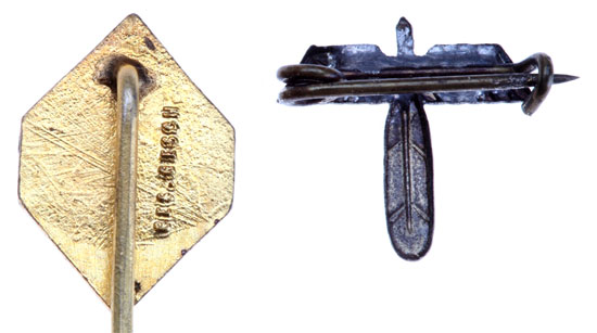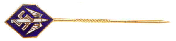 Stenographer Union Stickpin: Enameled and gold plated tomback, 10x15 mm hexagon, 5 cm knurled pin, marked Ges. Gesch., scarce pin!, light wear. (SOLD) Stenographer Union Lapel Pin: Winged quill pen, silver brennlach finish on tomback, 12x12 mm, easily lost small pin, rather scarce, light wear. (SOLD)