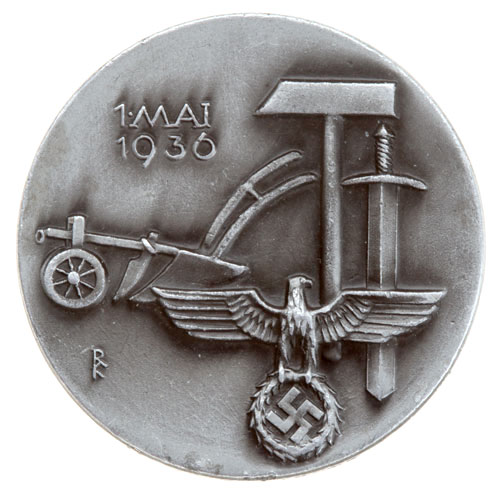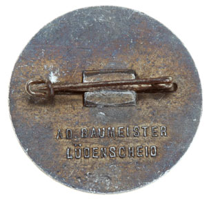 Tag Der Arbeit / 1. Mai 1936: Aluminum, 35 mm, crimp set steel pin, marked "AD. BAUMEISTER / Ludenscheid," nice toning, light wear.
