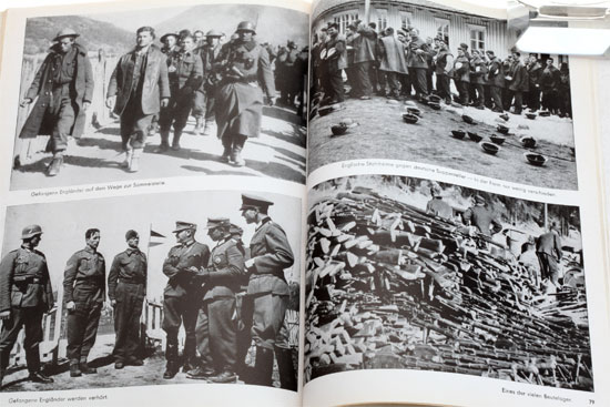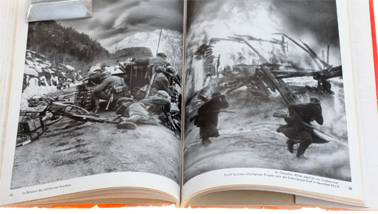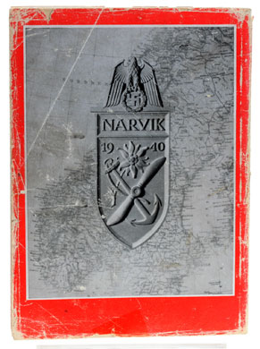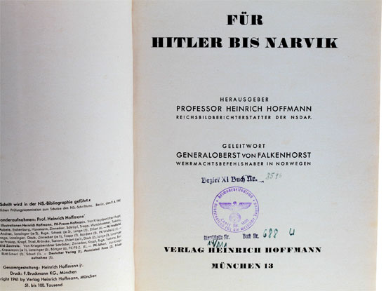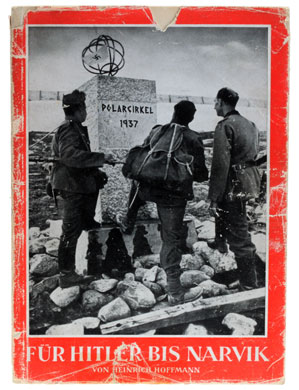 Fur Hitler Bis Narvik: Heinrich Hoffmann, Munchen 1941, 96 kaolin coated pages, 19 x 26.5 cm, RADWJ Lager 14/111 stamp on title page, soft bound cover, over 130 photographs documenting the Norwegian campaign, heavy wear and tape repairs to the dust cover, the book itself is in excelent condition.