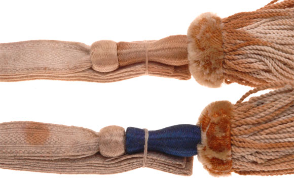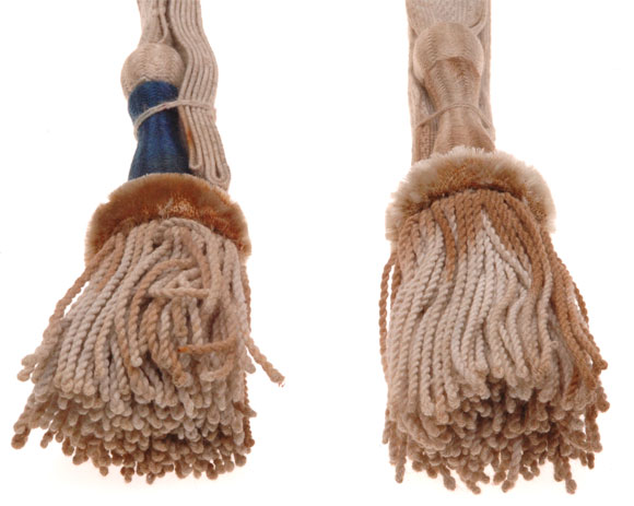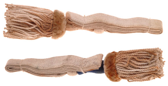 Sabre troddels were all the basic same construction, basic white strap and tassel, with the appropriate color for the Kingdom woven into the knot, stem, slider and strap. These came from a very old collection, blacklight tested, they are rare originals. I have no idea what German state issued them. They are unissued with the factory tie strings. The top of both knots show moderate to heavy grazing, tassels show stains from the wool dye above.