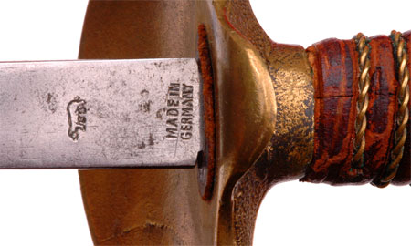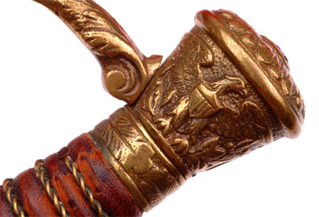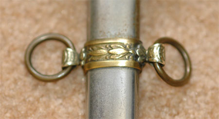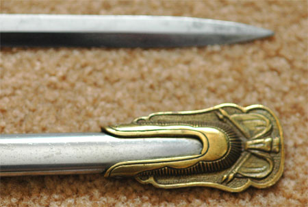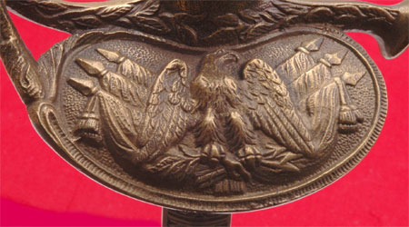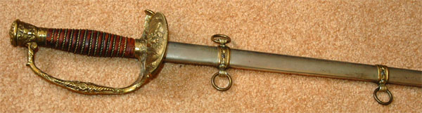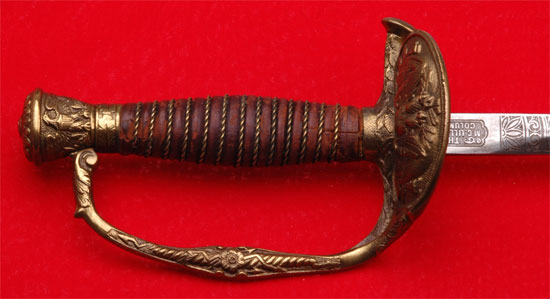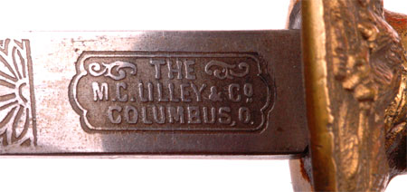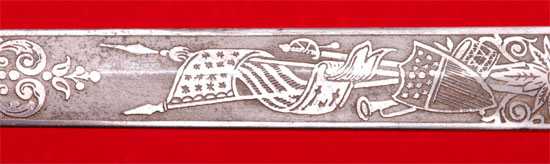 GAR Civil War Veteran Sword: Beautifully engraved blade by The M. C. Lilley & Co of Columbus Ohio, blank blade made in Germany, perfectly straight 30 inch blade, 16 and 17 inch engraved panels with patriotic United States GAR (Grand Army of the Republic) style motifs, excellent tip, leather grip with twisted wire wrap, fancy Solid Brass fittings and drag, nickle plated steel scabbard with no dents, overall very pleasing moderate wear.