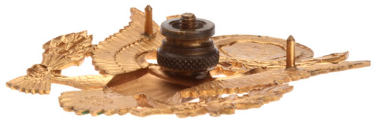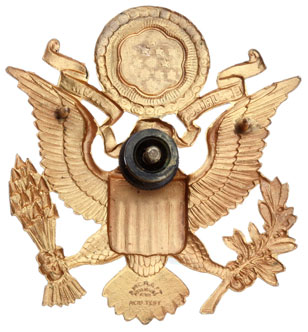 Army Officer Hat Eagle: Gold plated brass, 2.3 x 2 inches, 23.7 gm, marked Amcraft, Attleboro Mass, Acid Test; post and nut plus two prongs, light wear.