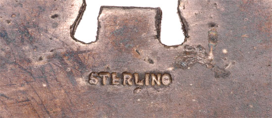 Shellacked sterling silver, 1.5 x 1 inch, starting to oxidize under the coating, light wear.