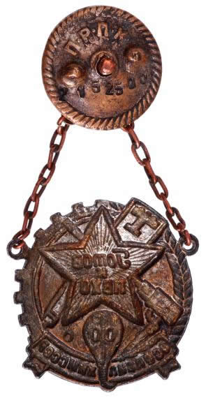 PVKhO - Ready for Anti-Aircraft and Chemical Defense: Bronze plated steel, enameled, 32x32 mm, serial 2152500, nice enamel, moderate wear.