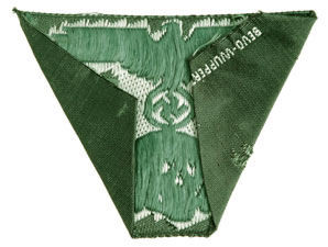 Waffen SS EM M-43 Hat Trapezoid: Dark grey/green 45 mm wide rayon base, undamaged 60 x 50 x 16 x 50 mm green and grey machine woven trapezoid insignia, marked full BEVO-WUPPERTAL under the fold, two small holes in excess material on the reverse, unissued.