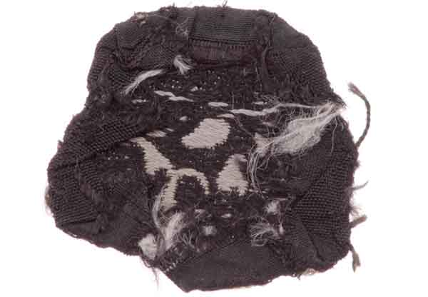 Waffen SS M43 Cap BeVo Skull: BeVo machine woven skull on a black rayon base, 28 x 29 mm, removed from an overseas cap, some threads remain, moderate wear.