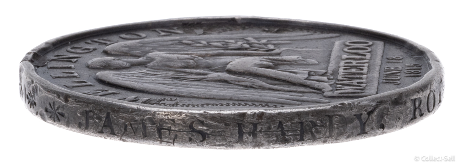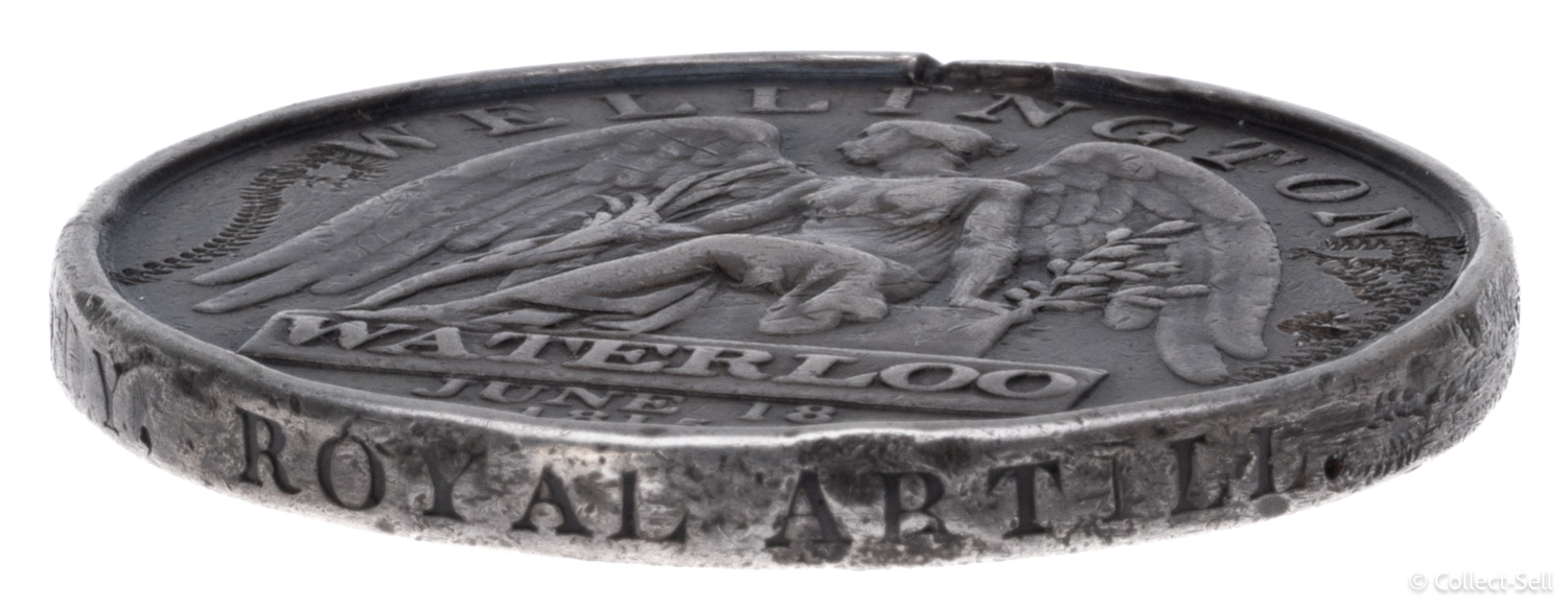 1816 Waterloo Medal, awarded to Gunner James Hardy of the Royal Artillery for his service in the Battle of Waterloo (June 18, 1815). The medal features a finely detailed design by Thomas Wyon Jr., the Chief Engraver at the Royal Mint, and is one of the earliest British campaign medals issued to all ranks who participated in a specific battle. Condition: Displays wear consistent with age, with crisp details remaining on both obverse and reverse. Tool marks on obverse and reverse, please see pictures. The edge inscription is clearly legible
