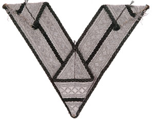 Wehrmacht Obergefreiter Rank Chevron: For the dress uniform, 24 mm wide green rayon and aluminum flatwire bevo weave tress with 9 mm diamond pattern stripes, skillfully sewn to have 80 mm sides, pre war example, mint condition.
