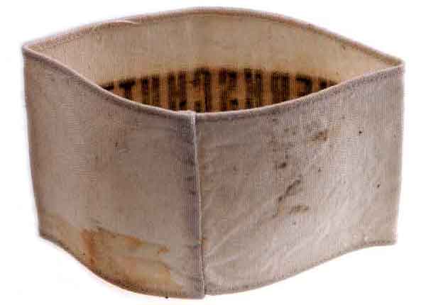 Werkschutz (Factory Protection): White cloth base, 35 x 10 cm, printed letters, some minor dirt and stains on the back (much, much lighter than in the photo), probably removeable by sponging with some detergent, moderate wear.