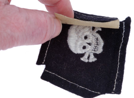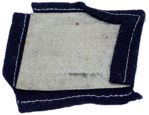 Black wool base with machine embroidered insignia partially sewn to a cream colored and shellacked buckram stiffener, 55x40 mm, Dachau hoard item, unissued, virtually mint condition, needs to be resewn with the correct period thread.