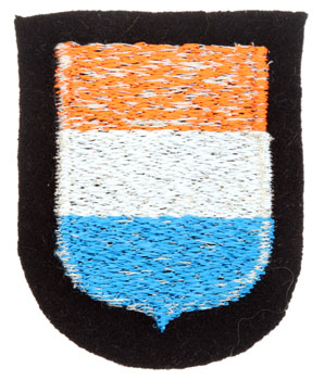 WSS Dutch Volunteer Sleeve Shield: black wool base, this is a late war Dachau hoard patch - 100% textbook!, machine embroidered shield, 51x65 mm, passed the black light test, unissued, beautiful mint condition.