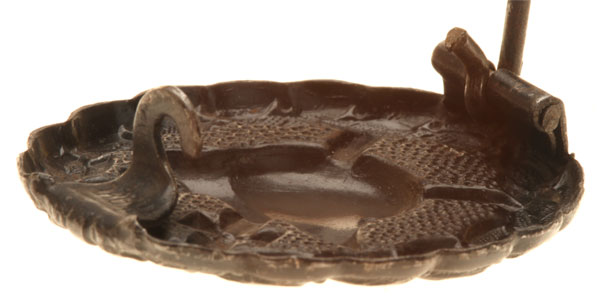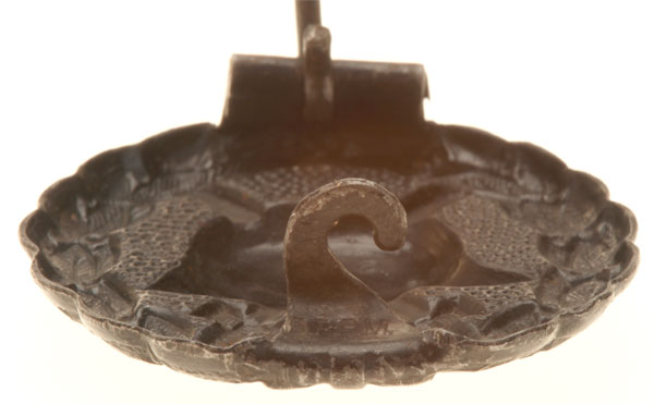 WW1 Black Wound Badge: Black painted steel, Catch, Hinge, and Wound Badge are hollow stamped as one piece in a special die. The comes out of the die with a slot to insert the pin and the catch comes out of the die hallmarked "D. R. G. M." (Deutsches Reich Gebrauchsmuster = German Reich Registered Design). The catch and hinge are then fed into another die to bend them 90 degrees to set the pin. The long pin is now stamped and bent so that when a short pin is crimp-set into the hinge, the top of the long pin looks like a lobster tail helmet. Seldom seen maker, 3.8 x 4.1 mm, 9.66 gm, light wear.