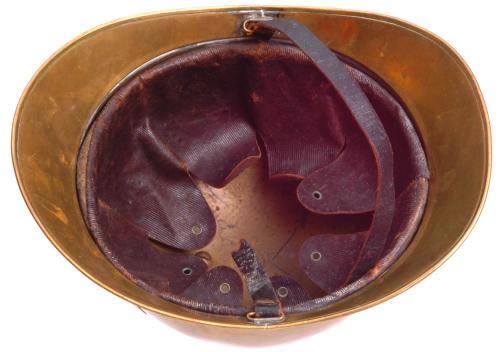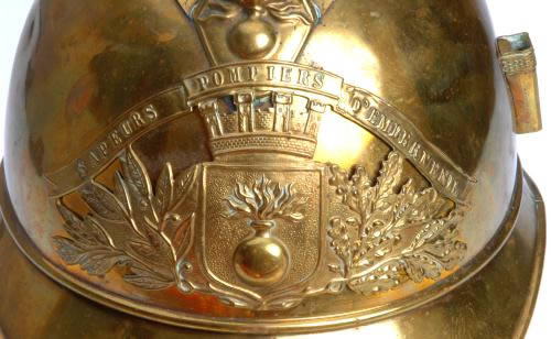 Solid brass, nice leather liner, buckle missing for chinstrap, feather plume missing, front plate reads "sapeurs pompiers d`embermenil," moderate wear.