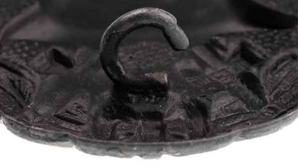WW1 German Black Wound Badge: Stamped blued steel, black enamel paint, early war, 38 x 43 mm, about 75% paint remains, moderate wear.