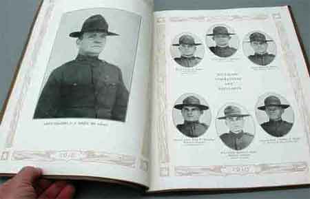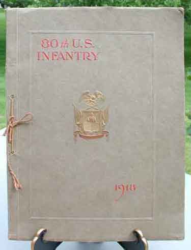 80th US Infantry Regiment, 1918: This is a really magnificent large format regimental unit history, 12.5 x 9.5 inches, approximately 100 un-numbered pages, there is a written history for each company, but what is really unique is that every single officer and enlisted man is named and pictured!! The full color artwork and hundreds of photos are all first rate quality. Light to moderate wear on the cover, inside pages are virtually mint. Quite rare and underpriced.