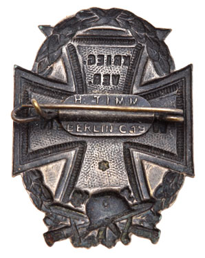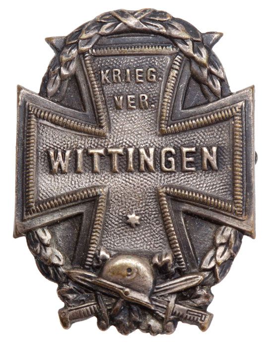 Wittingen Krieger Verein membership badge: (War Veterans Associaton) 27 x 38 mm, nickel plated tomback, pin plate maker mark: H. Timm, Berlin C. 19; light to moderate wear.