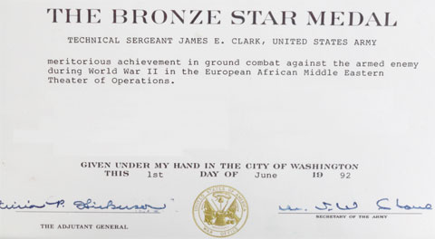 WW2 Cased Bronze Star: Cased Medal and Framed Certificate: for ground combat against the armed enemy in the WW2 African Mid East theater - to US Army Tech Sergeant James E. Clark, by 1962 executive order of the president of the USA.