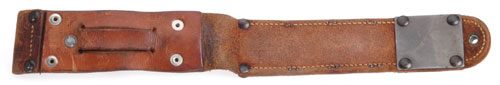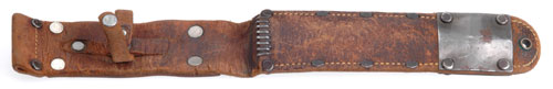 RARE Fighting Knife: 6.5 inch blued blade, marked US M3 KINFOLKS INC.; stacked leather washers grip, marked pommel, only 135,548 were made by this rare company, sharpened, moderate wear. The even rarer leather sheath is marked US M6 MILSCO 1943, with 20 rivets, two steel plates, eight throat staples, heavy wear.