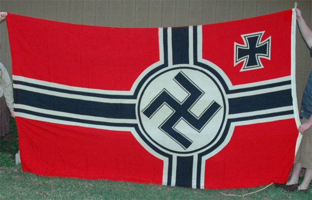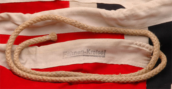 Reichskriegsflagge 200x335: Printed design on a red cloth body, two sided, mirror reverse, 6 rows of reinforced stitching at top and bottom edge, 8 rows on the end; 1 cm woven rope sewn into a 5 cm white canvas reinforced hoist edge, hallmarks: Navy Marine Eagle, Reichskriegsfl. 200x335 centimeters (6.56 x 11 feet) Fahnen-Kreisel (Kreisel Flag Factory); strong colors, no stains or problems of any kind, virtually mint condition.