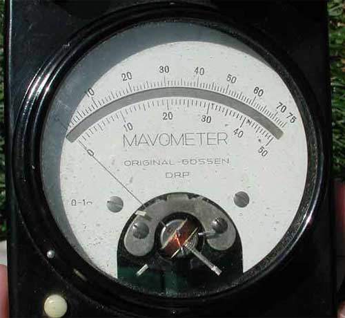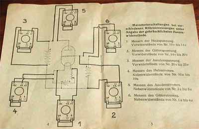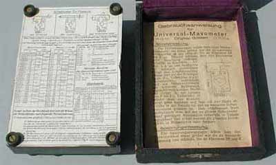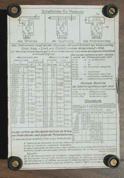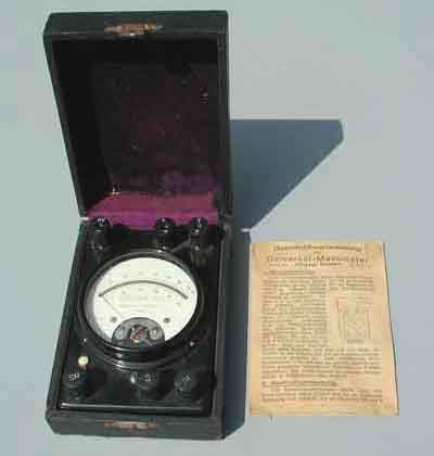 Boxed Mavometer (Volt & Ohm Meter): The mavometer was a combination Volt - Ohm Meter and measured direct current in milliamperes and millivolts and resistance in ohms. The instrument case is bakelite and measures 12.5 x 8.5 x 4.5 cm. The viewing window is 7 cm. The dial reads Mavometer Original-Gossen DRP (Deutsche Reichs Patent). There are six bakelite screw down fasteners with impressed letters to guide the operator in hooking up the instrument. The bottom of the meter has four screwed on legs and three wire attachment schematic diagrams. All the components are intact. The small measurement dial indicates it was used on delicate electrical circuits and equipment. The meter comes complete with its original 10 page instruction booklet which gives detailed instructions on how to use the instrument, a rare piece of kit, excellent working condition.