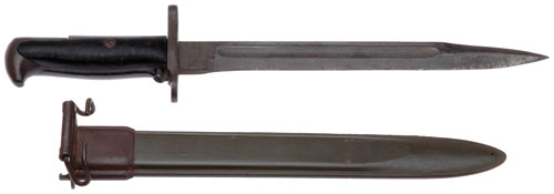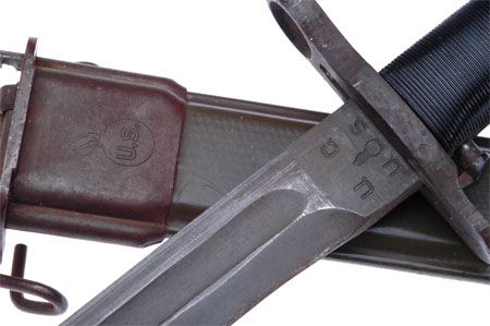 WW2 M1 Garand Bayonet: 1944-45, Push button release, original 10" parkerized blade, nice even color, marked U.C. US, 4" black bakalite grip; 11" olive-green fiberglass scabbard marked U.S. and BN l/9 REP.; light even wear.