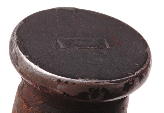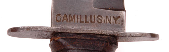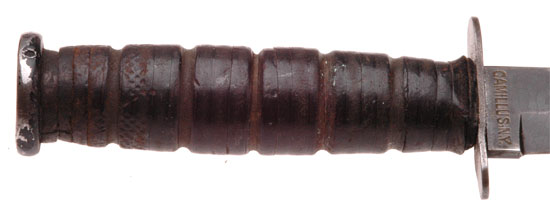 USMC Knife: 7 inch blued blade, stacked leather washers grip, pinned pommel, blade stamped CAMILLUS N.Y. one one side, U.S.M.C. on the other; brown leather sheath with nine brass staples, overall moderate wear.