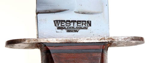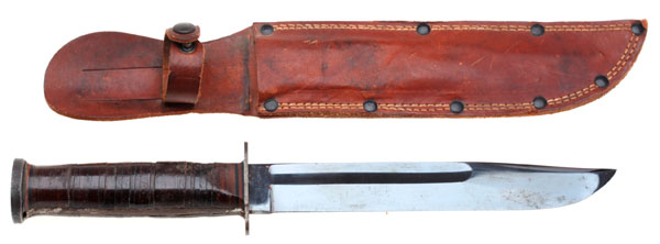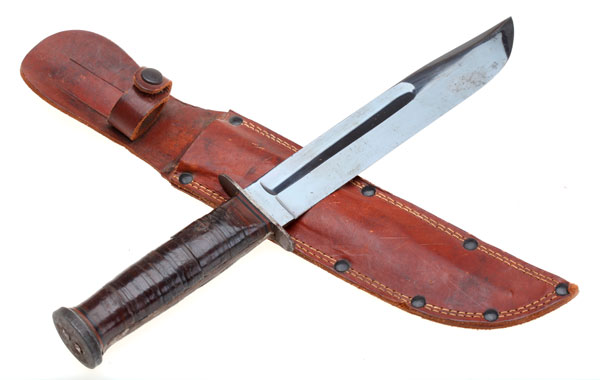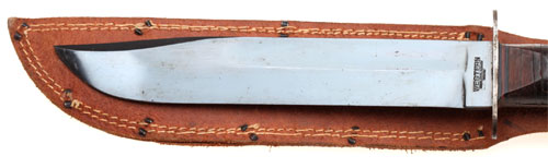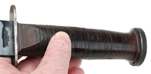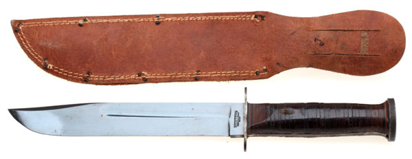 WW2 Western Fighting Knife 8 inch Blade: 8 inch bright blued blade, stacked bakelite and leather washers grip, double peaned tang, blued steel pommel; correct double stitched burgundy leather Western sheath with 9 blued rivets, riveted hilt retaining strap with a blued snap, overall very light wear. Western knives were much better made, cost more, and because of this, the government ordered far less than the larger blade manufacturers like Camillus and Union Cutlery (Kabar). These knives are like a work of art and are very scarce today.